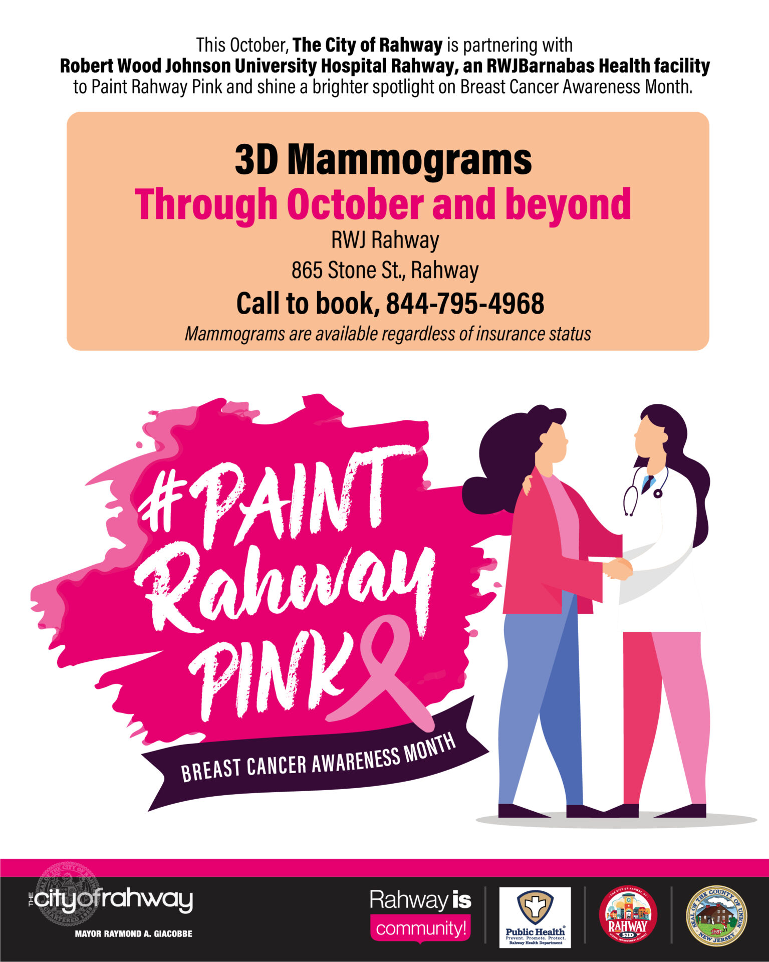 The City of Rahway recognizes that October is Breast Cancer Awareness Month. Join survivors, care givers and supporters as the flag is raised over City Hall Plaza. Visit www.cityofrahway.com/health for details and a full listing of events scheduled throughout the month of October. 3D Mammograms are available at RWJ Hospital, 865 Stone Street. Call 844-795-4968 to book a screening. (regardless of insurance status).