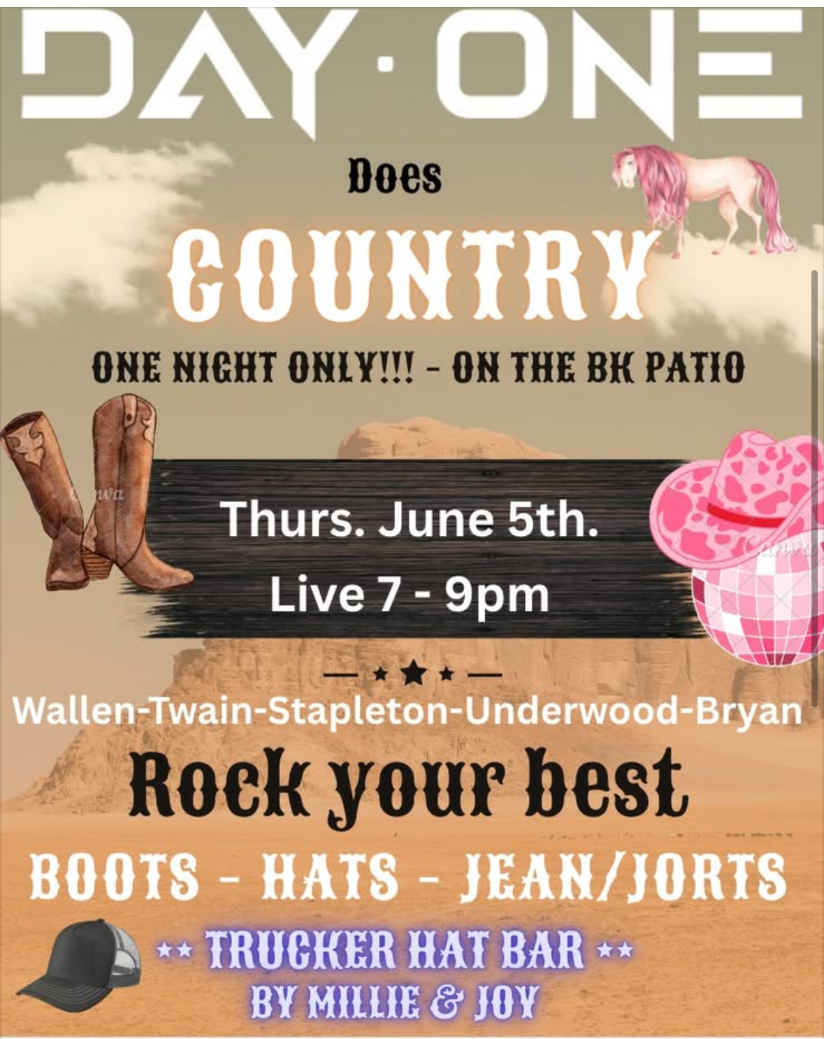 Rock out in your best Boots, Hats & Jeans to the country sounds of Day One, out on the side patio. Featuring **the Trucker Hat Bar** brought to you by Millie & Joy.