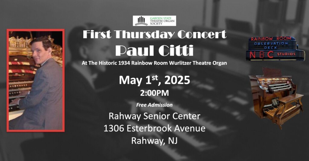 A First Thursday Concert, featuring Luke Staisiunas performing on the historic 1934 Rainbow Room Wurlitzer Theatre Organ at the Rahway Senior Center.