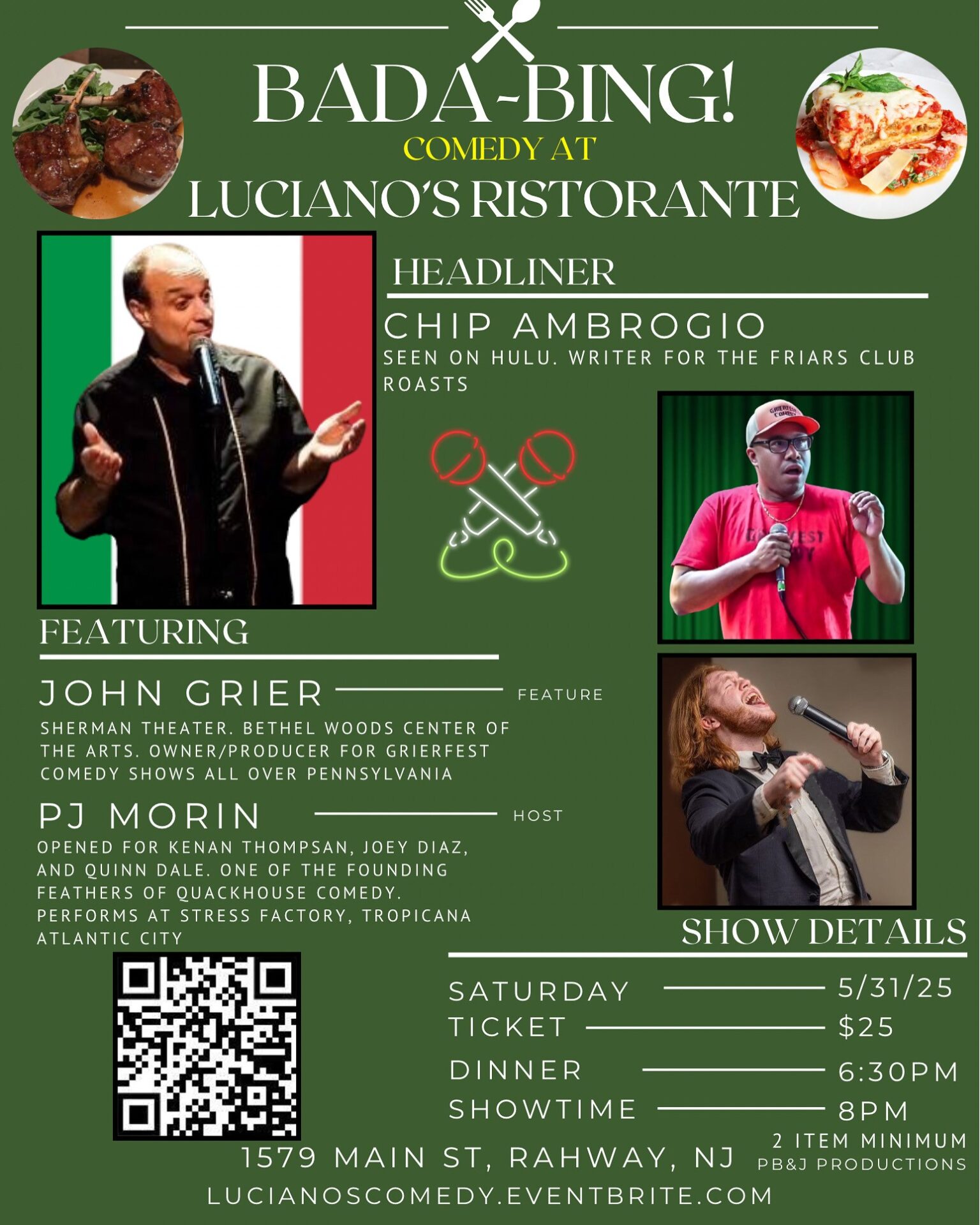 Bada-Bing Comedy featuring Chip Ambrogio, John Grier and PJ Morin. Showtime is at 8:00 p.m. For tickets go to:: https://www.eventbrite.com/e/bada-bing-comedy-show-at-lucianos-ristorante-53125-tickets-1362371573049.