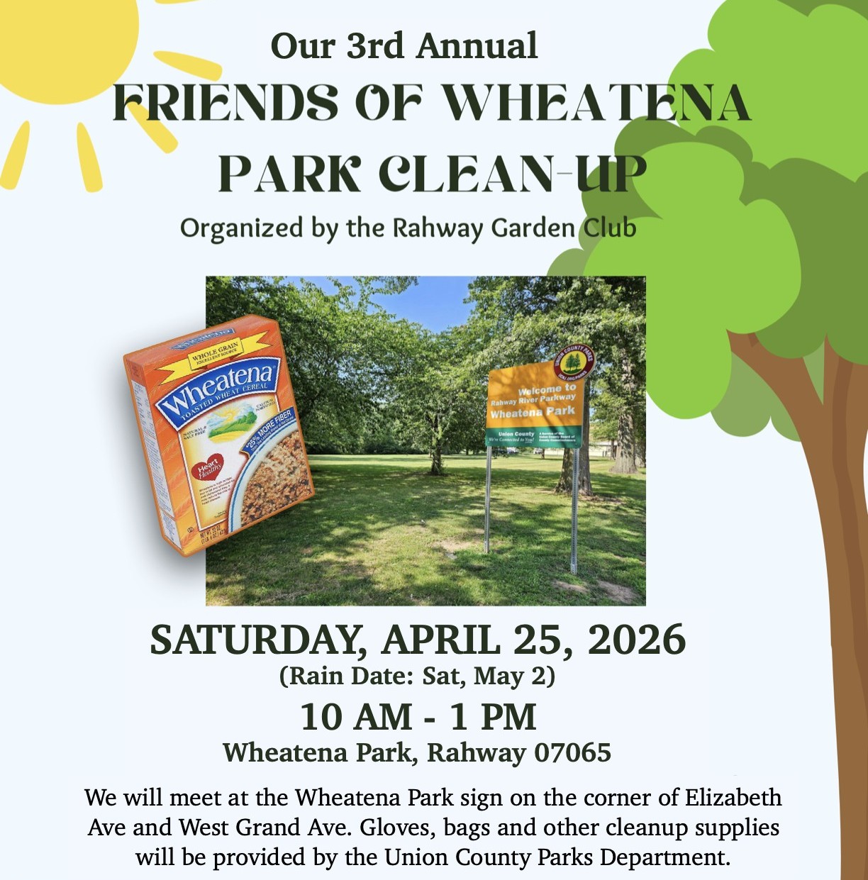 Meet up by the Wheatena Park sign to join the clean up effort. Gloves, bags and supplies will be provided by Union County Parks Dept.