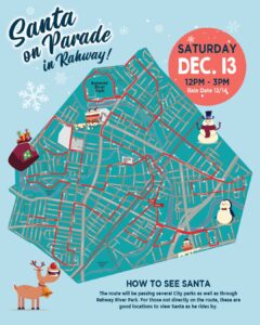To access the link for the parade route, click on the Santa on Parade title, or go to: http://www.cityofrahway.com/santaonparade Rain date December 14th.