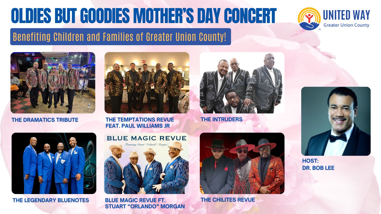 Oldies but Goodies Mother’s Day Concert benefiting families in greater Union County. Hosted by Bob Lee. Doors open at 4:00 p.m. Featuring: The Dramatics Tribute, The Temptations Revue, The Intruders, The Legendary Bluenotes, Blue Magic Revue, The Chilites Revue. For more information go to https://ucpac.org/event/oldies-but-goodies-mothers-day-concert. This incredible event isn’t just about great music; it’s also about giving back. All proceeds benefit families in the Greater Union County community