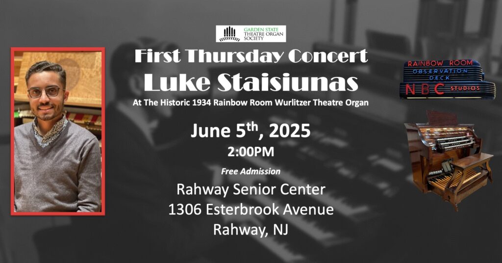 A First Thursday Concert, featuring Luke Staisiunas performing on the historic 1934 Rainbow Room Wurlitzer Theatre Organ at the Rahway Senior Center.