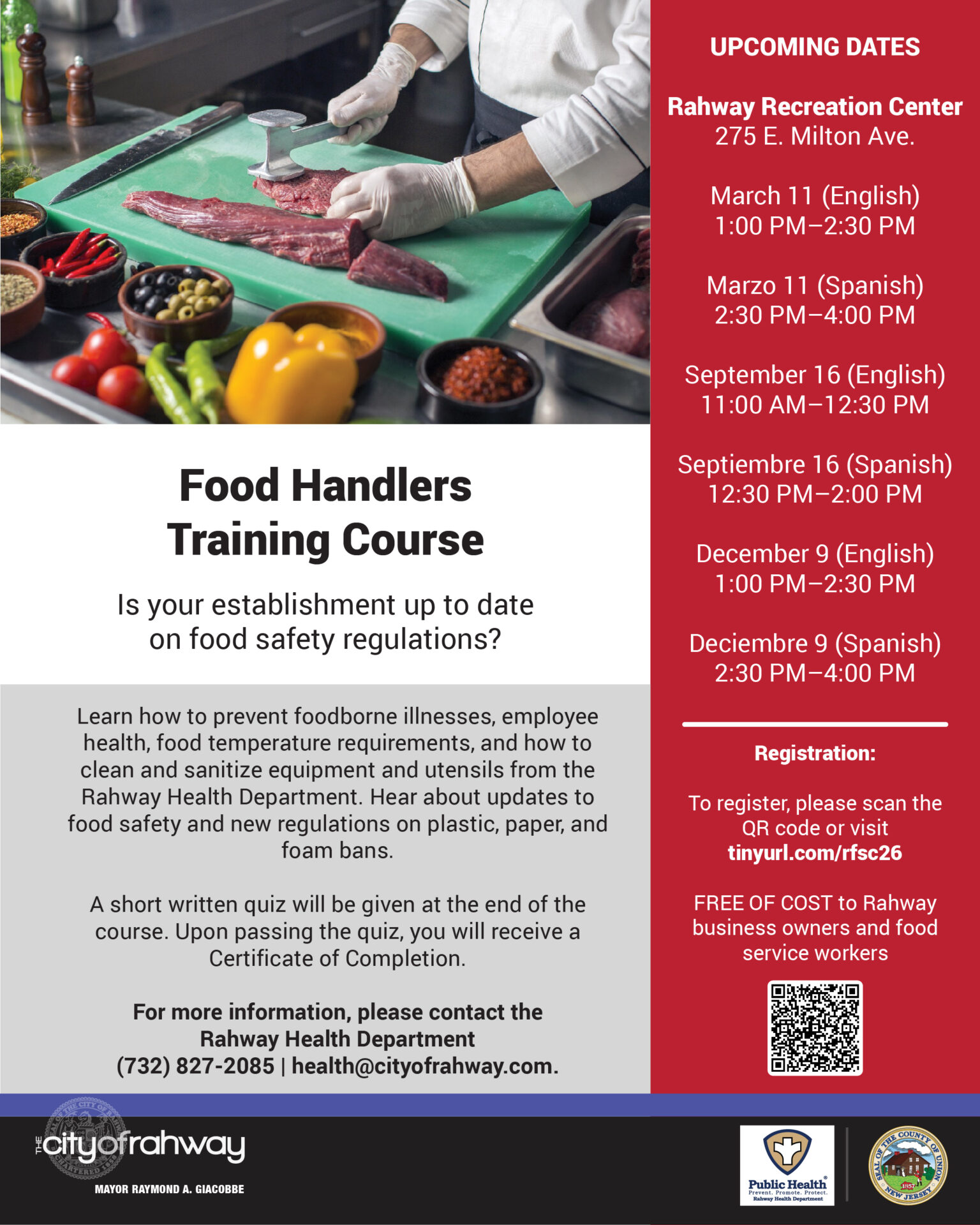 Free of cost to Rahway business owners and food service workers