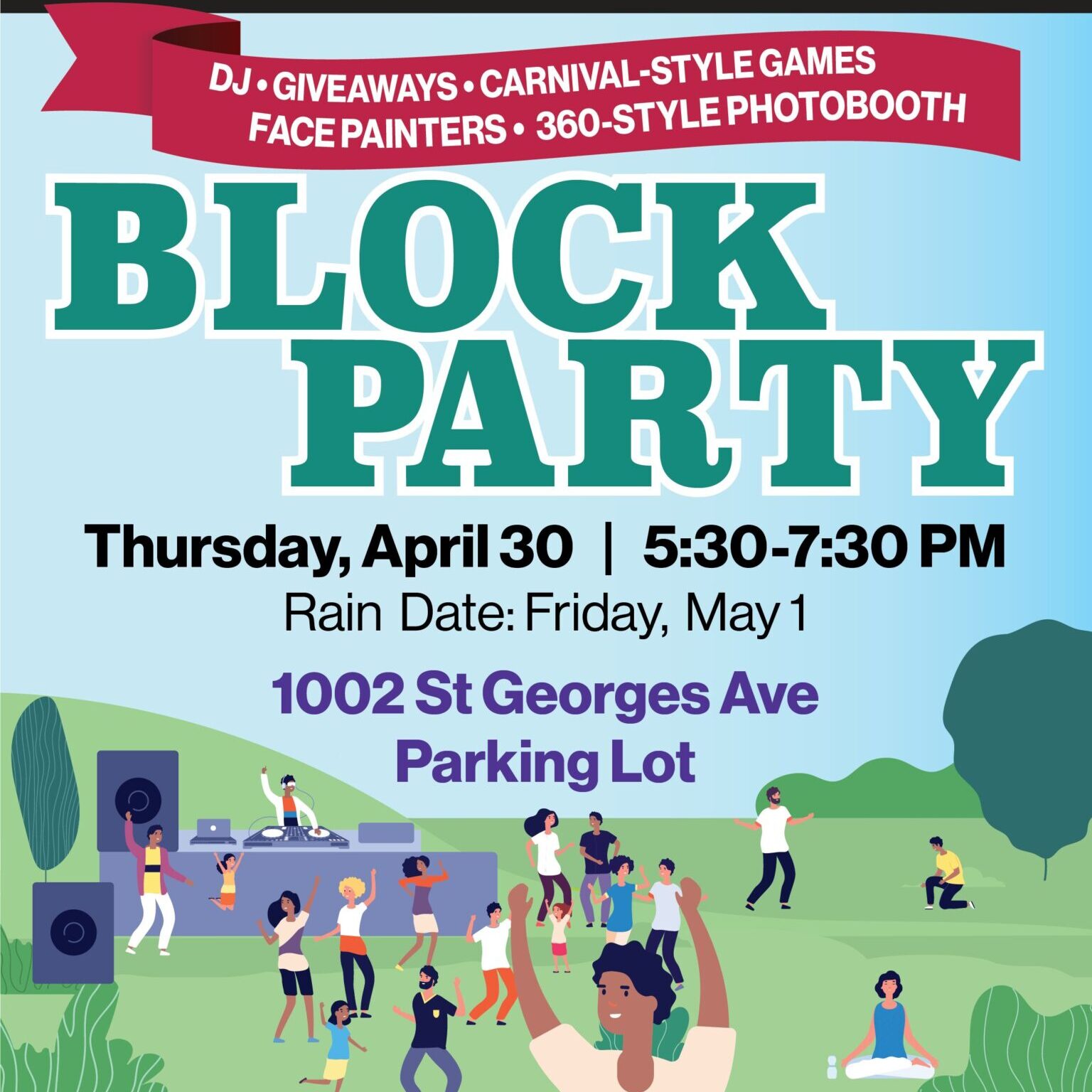 DJ Giveaways - Carnival Games -Face Painters - 360 Photo Booth and FOOD! Rain-date May 1st. Same time & place. Come on out and have an evening packed with fun, food and neighbors.