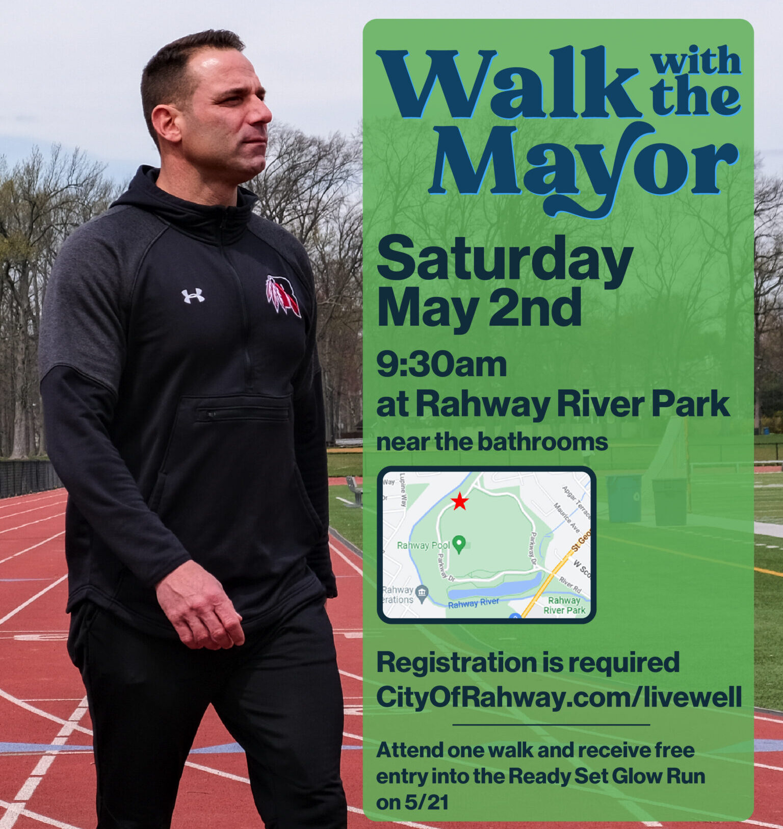 Meet up near the restrooms. Attend one walk and receive free entry to participate in Ready Set Glow May 21st.  Registration is required. Go to http://cityofrahway.com/recreation