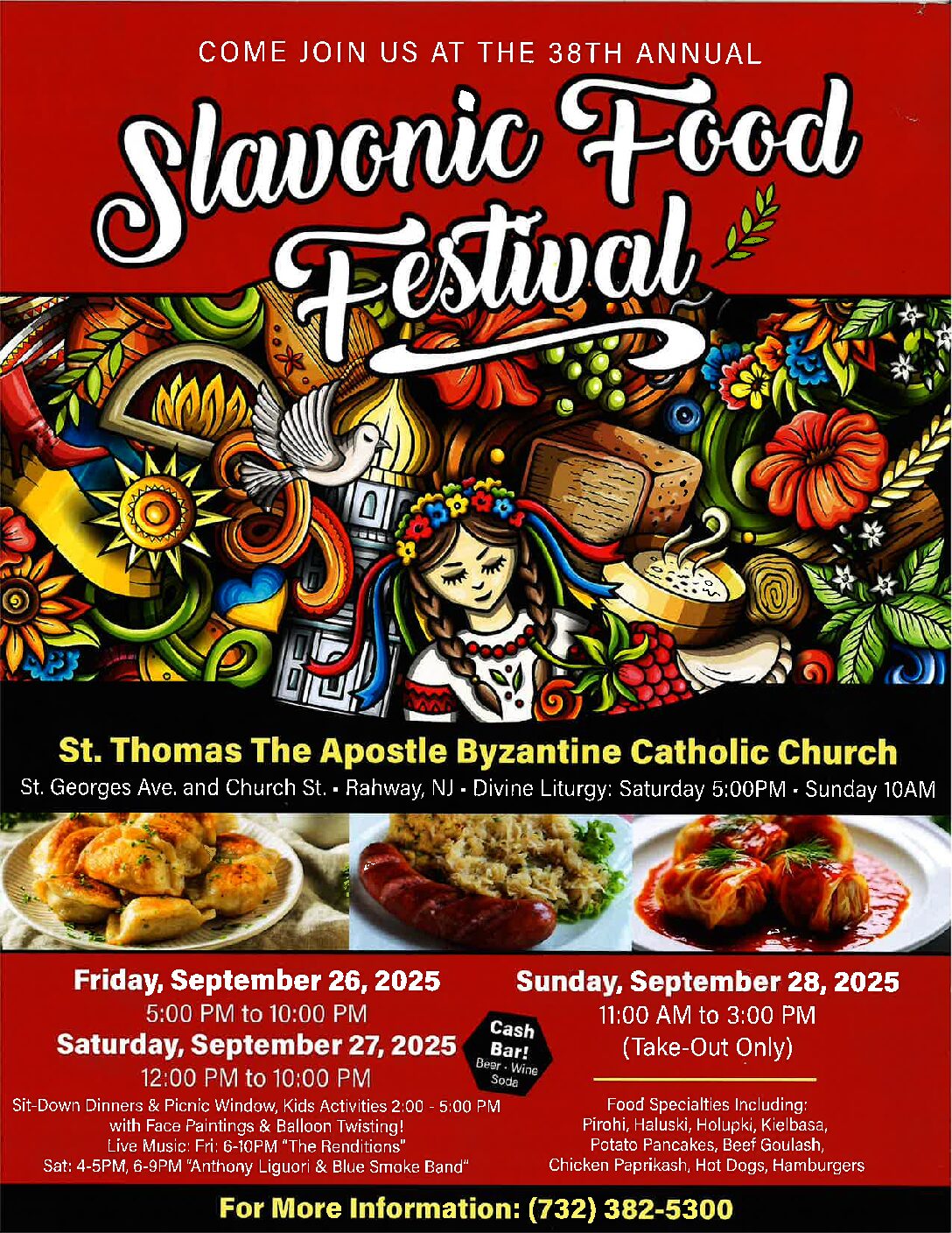 St. Thomas The Apostle Byzantine Catholic Church St Georges Avenue & Church StreetLast day to enjoy the festival. Finish out the week-end and bring your favorite dishes home. For information call 732-382-5300.