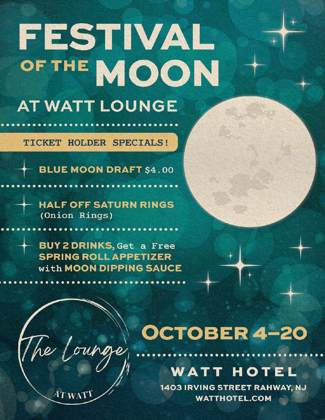 The Lounge at the Watt 1403 Irving Street, Rahway, NJ, United StatesShow your ticket for any Festival of the Moon event and enjoy one of these Festival of the Moon Specials.