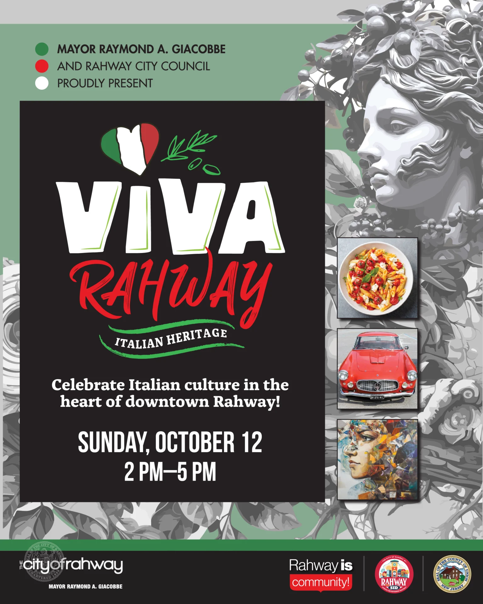 We are happy to announce the inaugural Viva Rahway: Italian Heritage, a celebration of Italian culture and community, taking place Sunday, October 12, from 2:00–5:00 PM on Main St. in Downtown Rahway (1579 Main Street Rahway, NJ 07065)